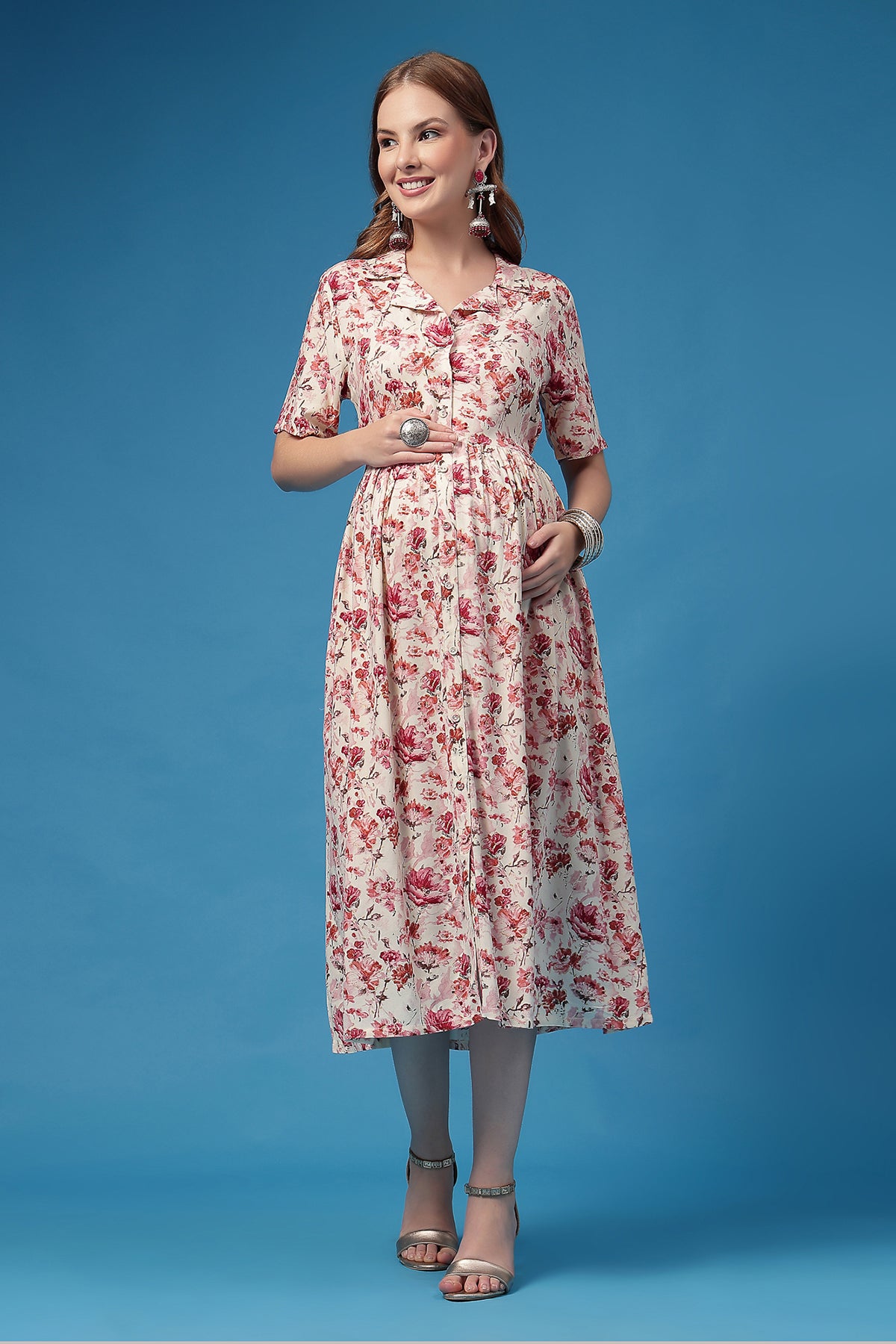Sash tie at back → adjustable elegance as your body changes.Front-open placket → discreet, fuss-free feeding access (because mama deserves easy moments).
