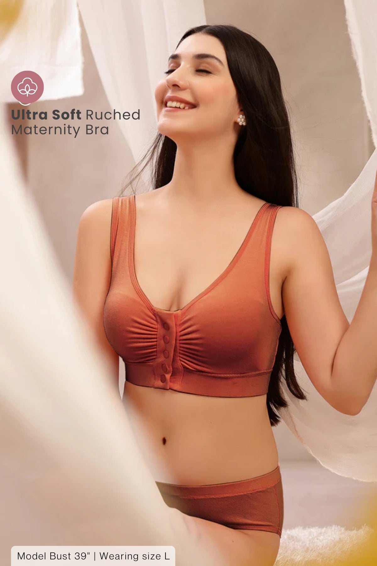 From just pregnancy to postpartum, your body is constantly evolving, this non-padded ruched bra is designed to evolve with every changing you. Whether you're nursing, napping, or simply taking a breather, it delivers soft support and gentle softness because you deserve to feel wrapped, not restricted. Wear this rust shade under Reds and bold shades to keep your hot girl energy intact !