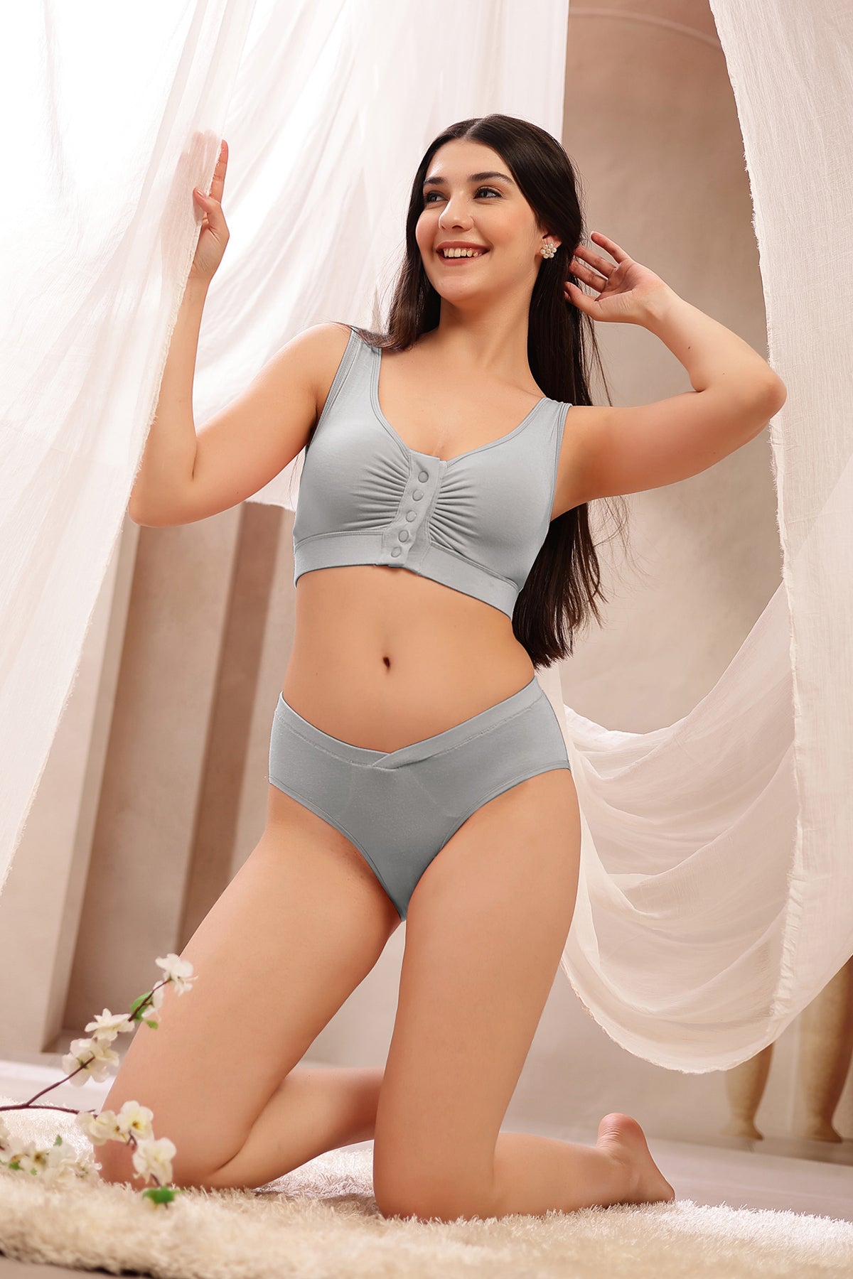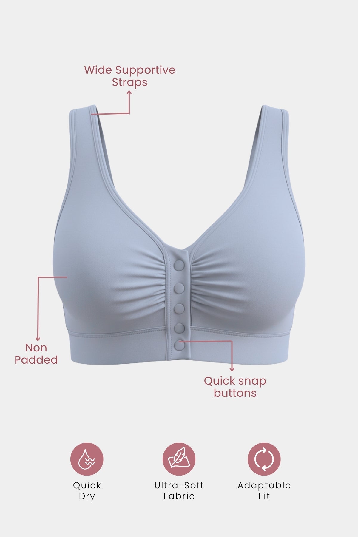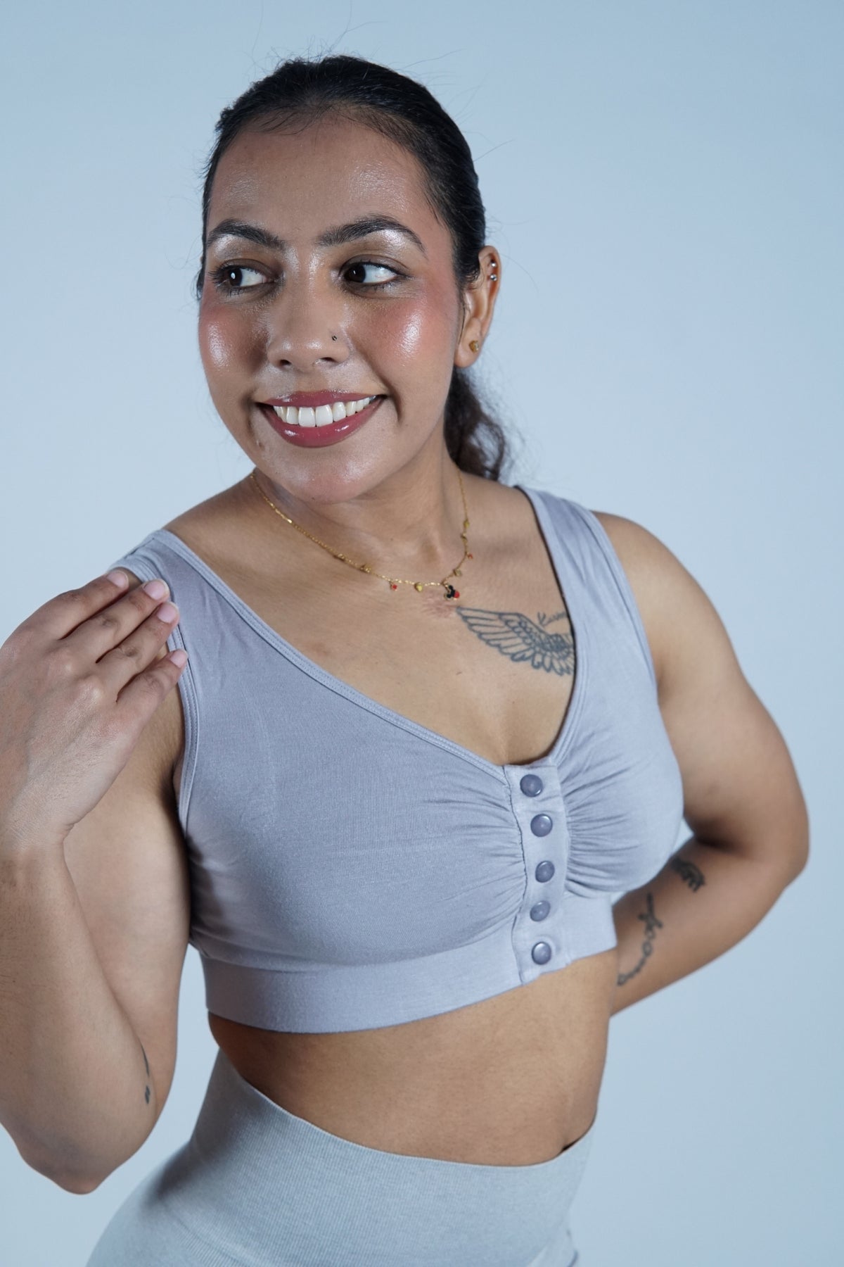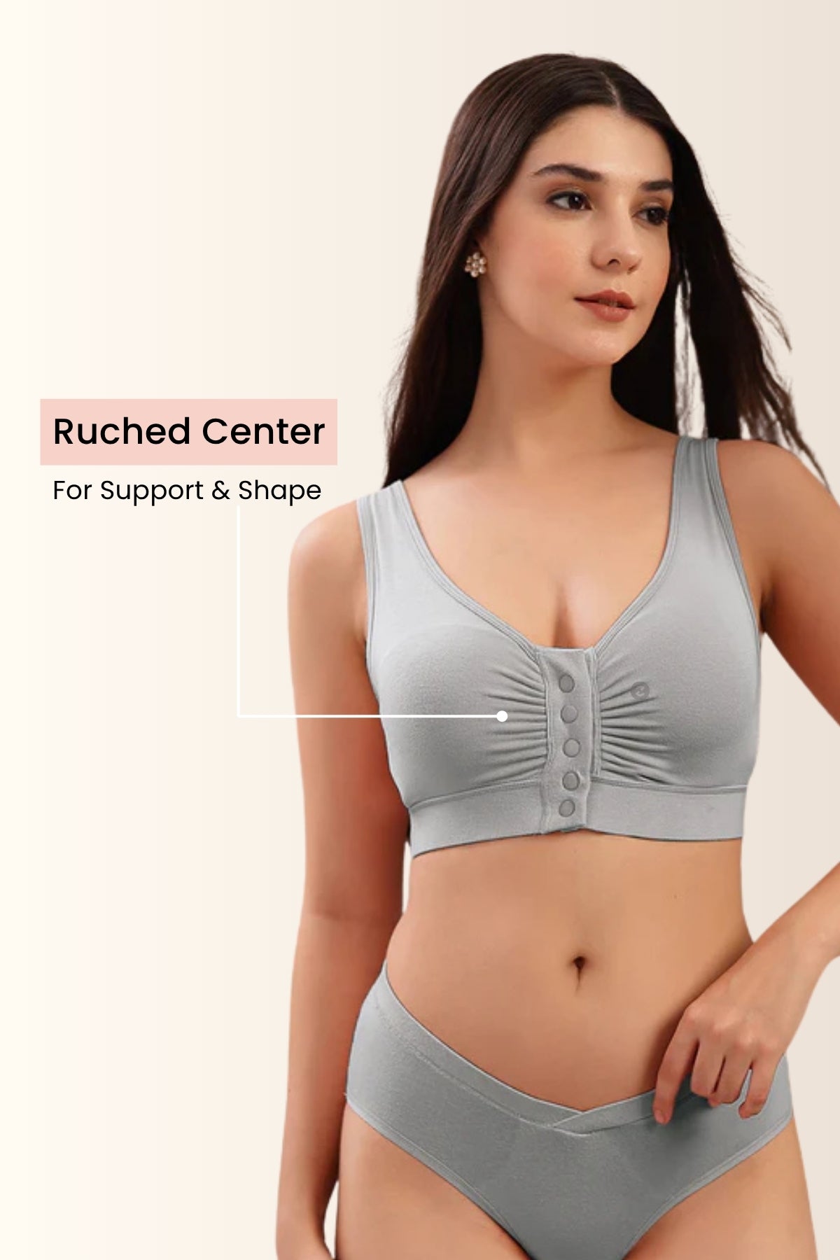 From the first flutters to early hour feeds, your body is constantly evolving, this non-padded ruched bra is designed to evolve with every changing you. Whether you're nursing, napping, or simply taking a breather, it delivers gentle support and unmatched softness. Wear Silver grey under your Blacks, Charcoal and even pastel shade apparels.