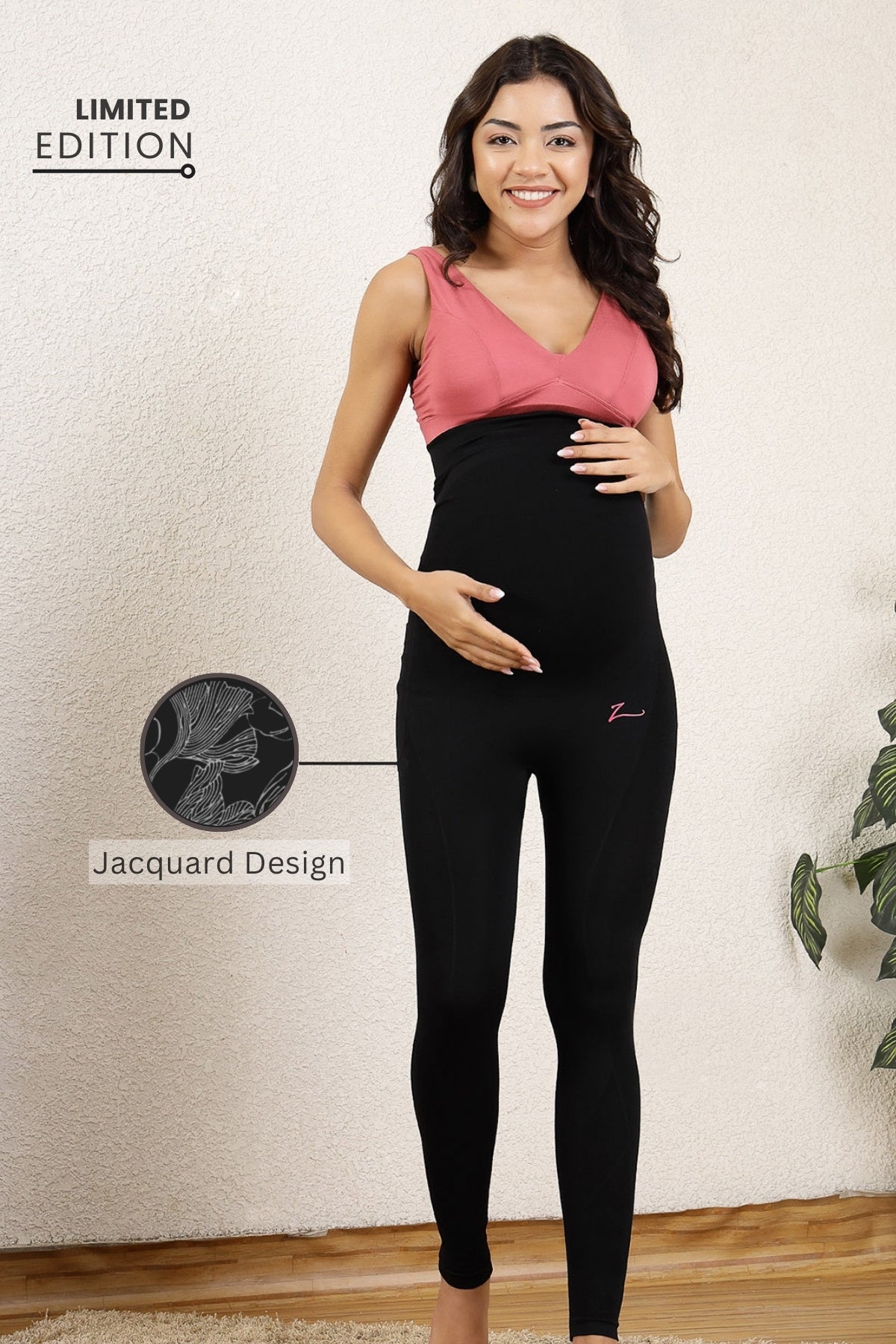 Seamless Adaptable Bump Support Black Floral Jacquard Maternity Legging