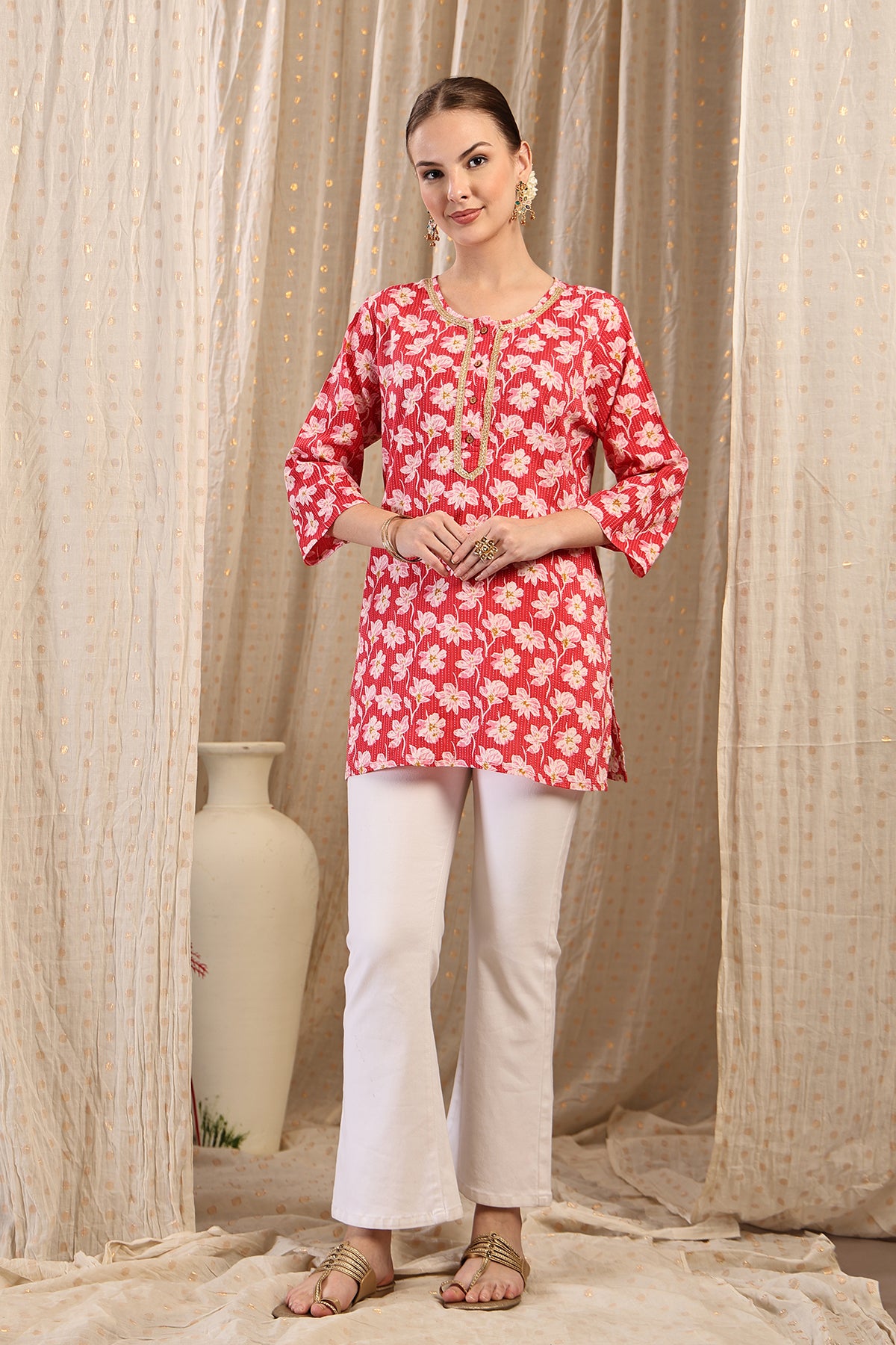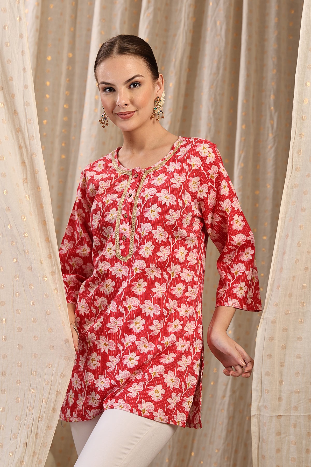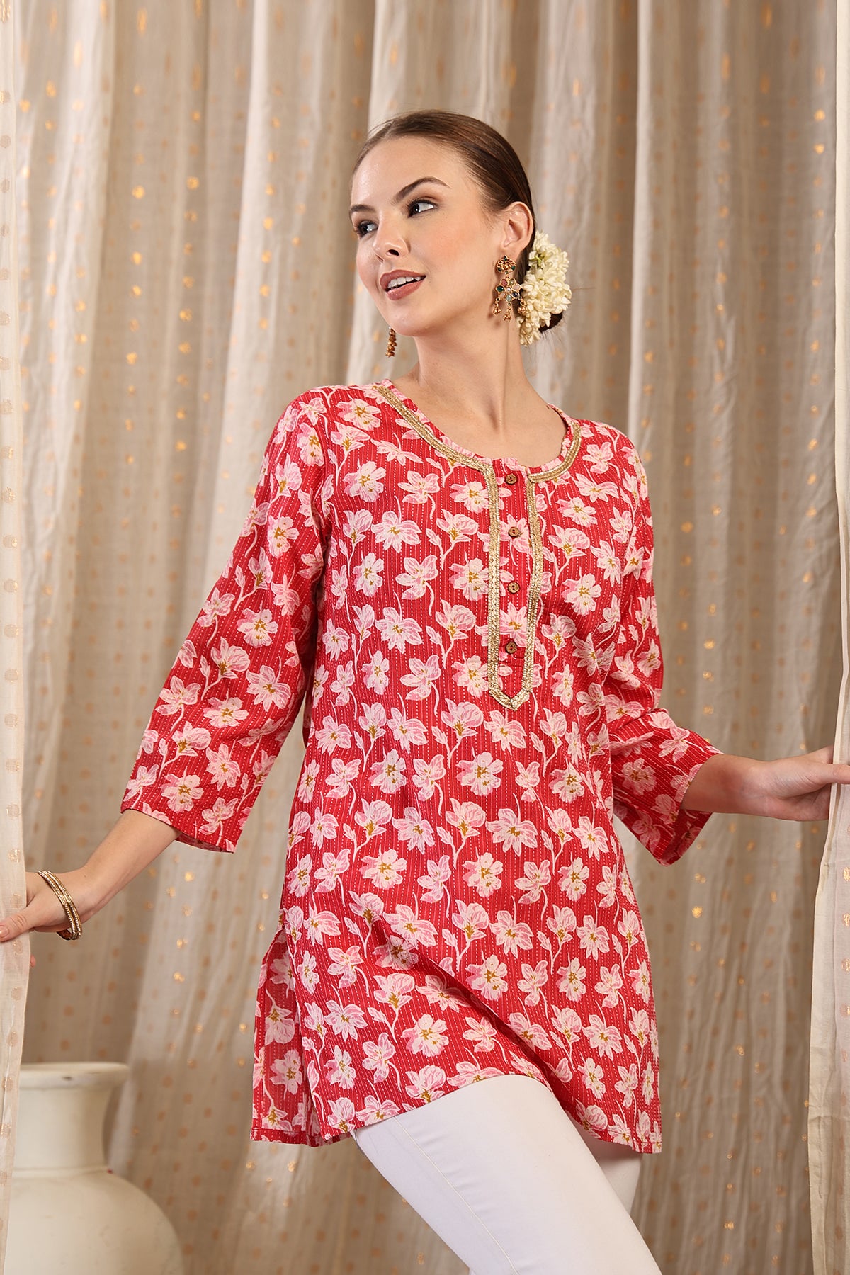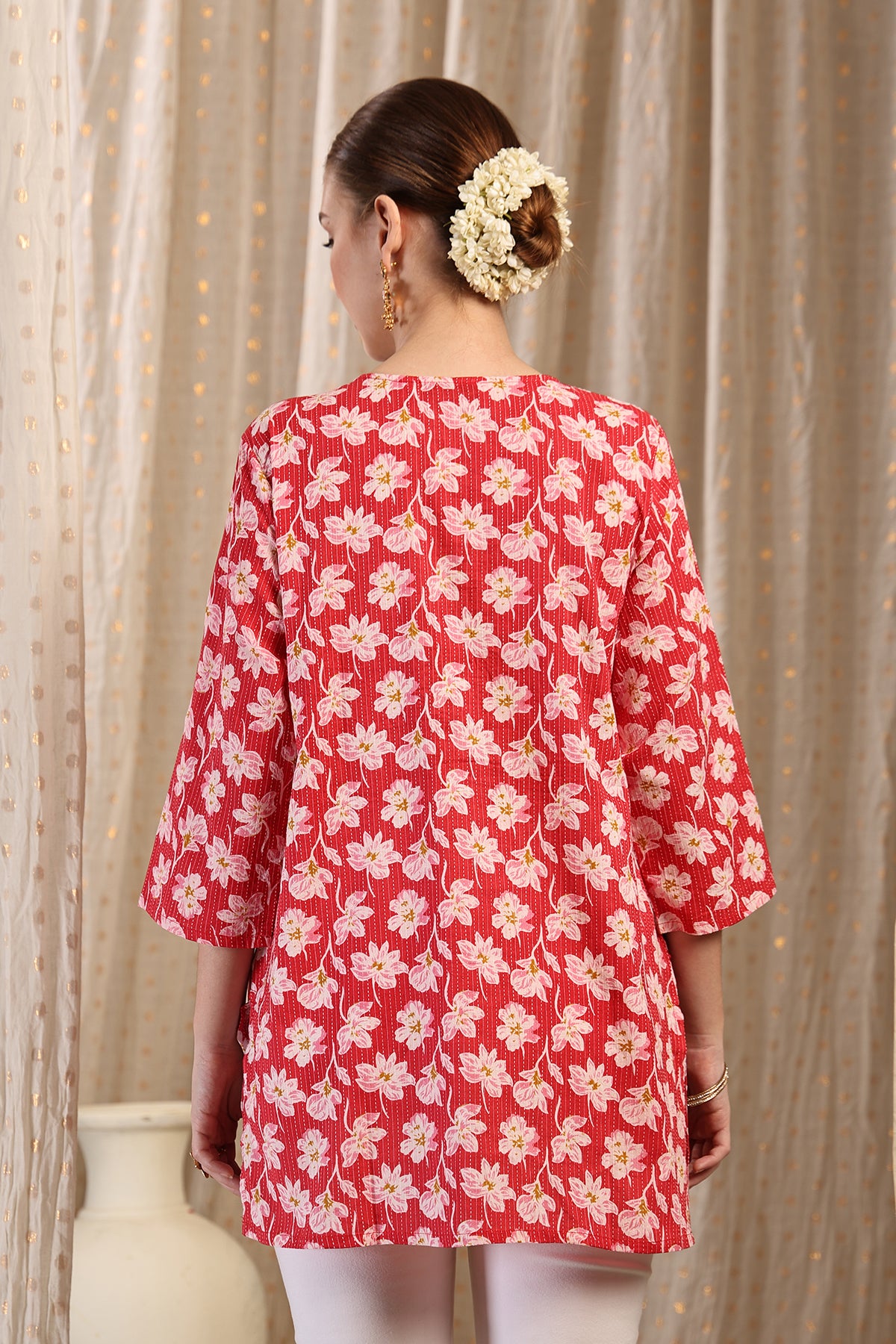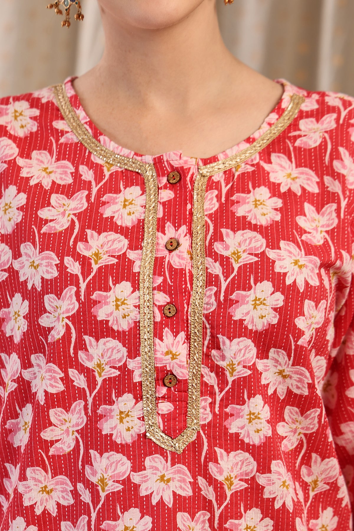 Zipless Feeding Cotton Top with Embroidered Neck - Red Floral