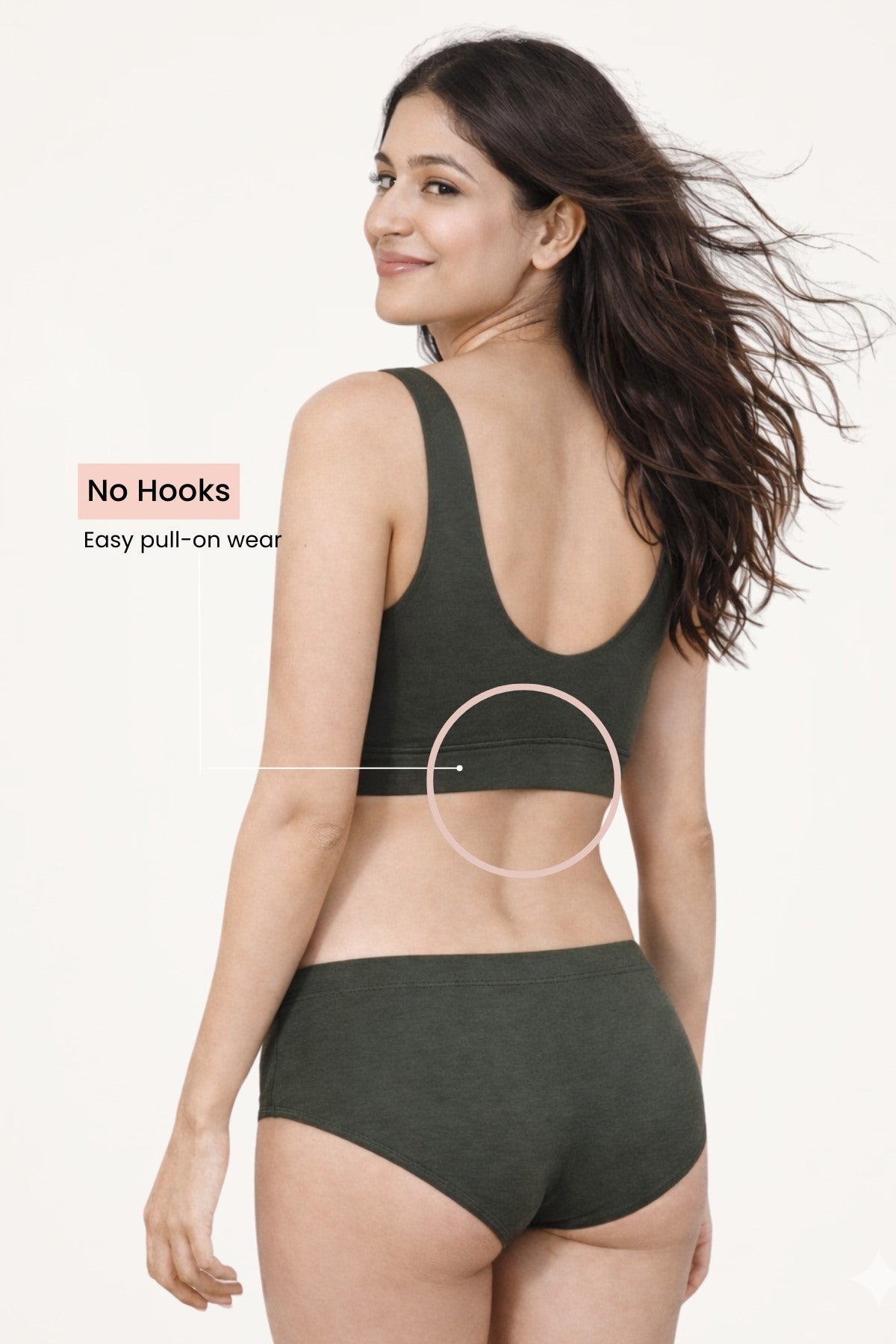 Stop settling for less. This army green bra is your ultimate secret weapon! It's made from a premium buttery-soft fabric which moves with you. It includes ultra-absorbent, removable pads designed to keep you feeling dry and perfectly supported (no more leaks or heaviness!). We finished it with broad, no-dig bands at the shoulder and underbust. This bra doesn't just support you - it improves your entire day.