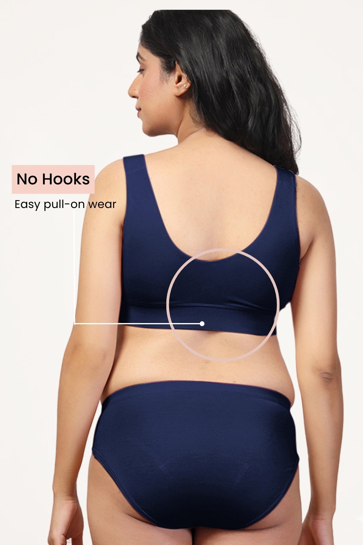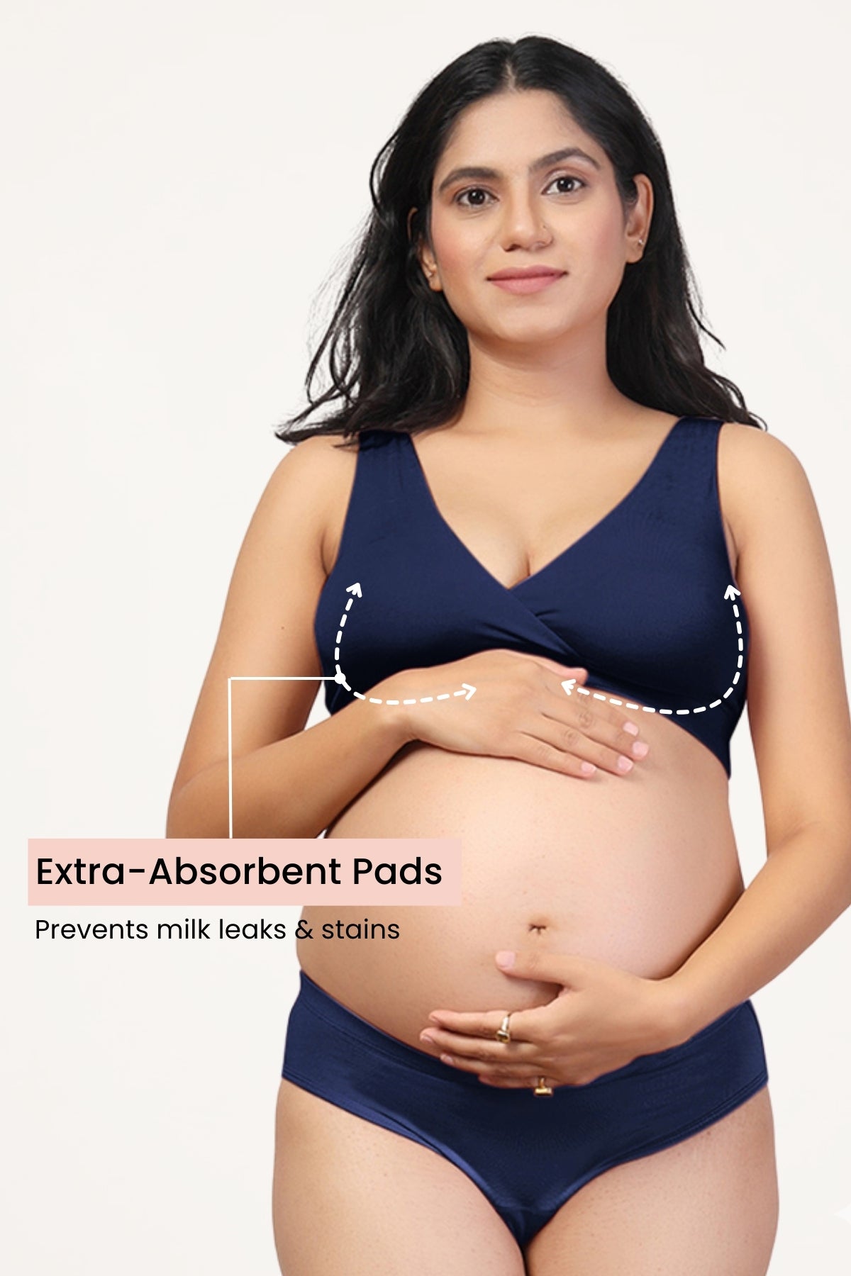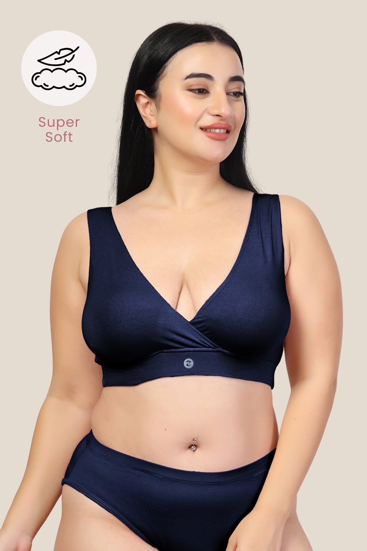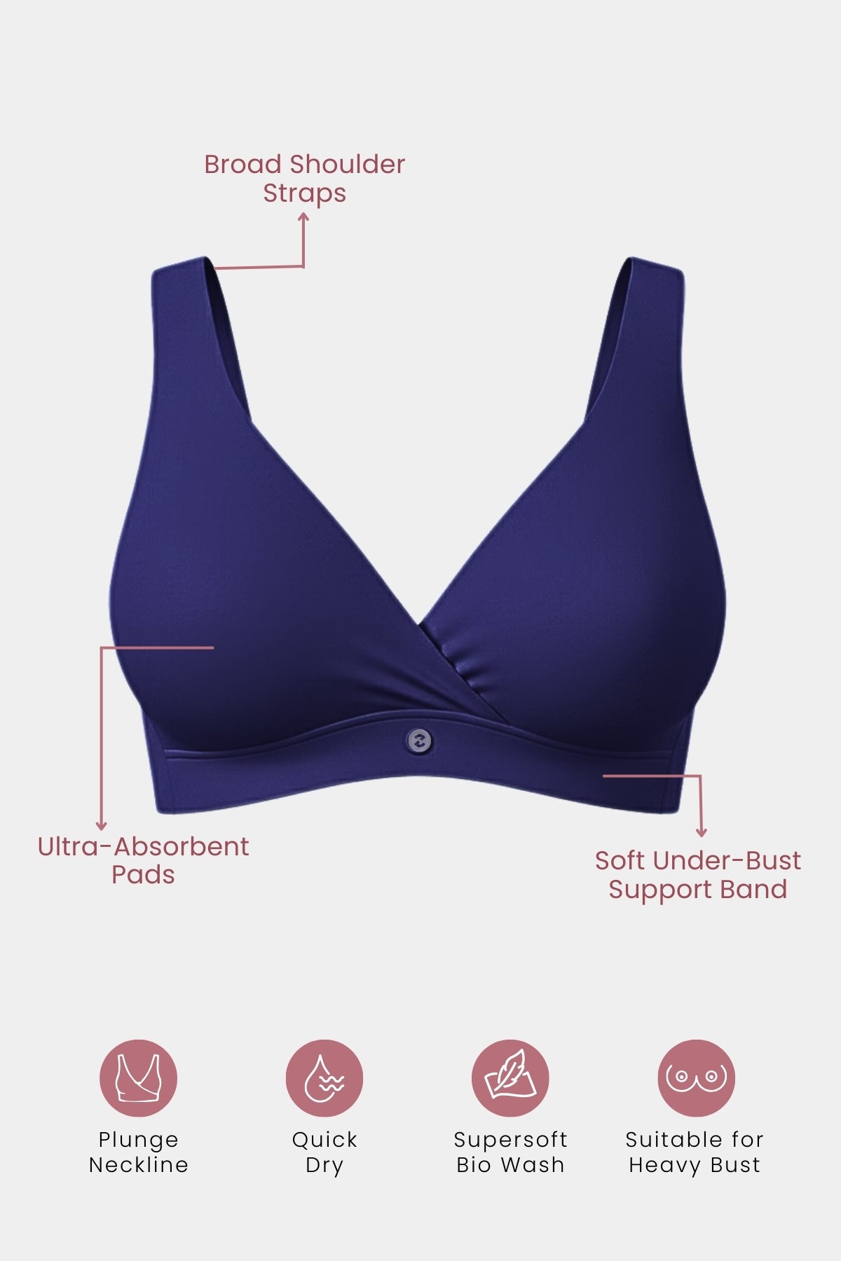 Crafted from 95% Lenzing™ Modal and 5% Elastane, providing 4 way lycra stretch fabric for adaptability and broad (soft) under-bust band for support & snuggle fit. Comes with removable & highly absorbent breast pads to cover your leaky moments. Wear your bold Navy blue shade under dark shades of blue and get rid of your Monday blue !