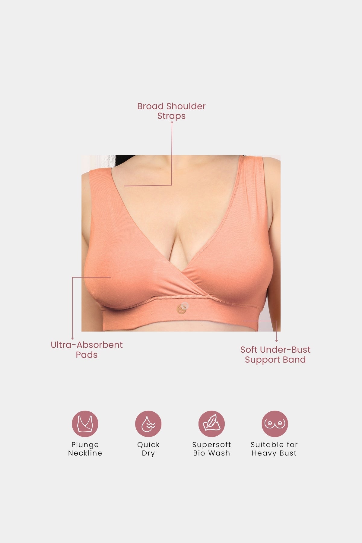 Crafted from 95% Lenzing™ Modal and 5% Elastane, providing 4 way lycra stretch fabric for adaptability and broad (soft) under-bust band for support & snuggle fit. Comes with removable & highly absorbent breast pads to cover your leaky moments. Wear peach under your soft shaded apparels.