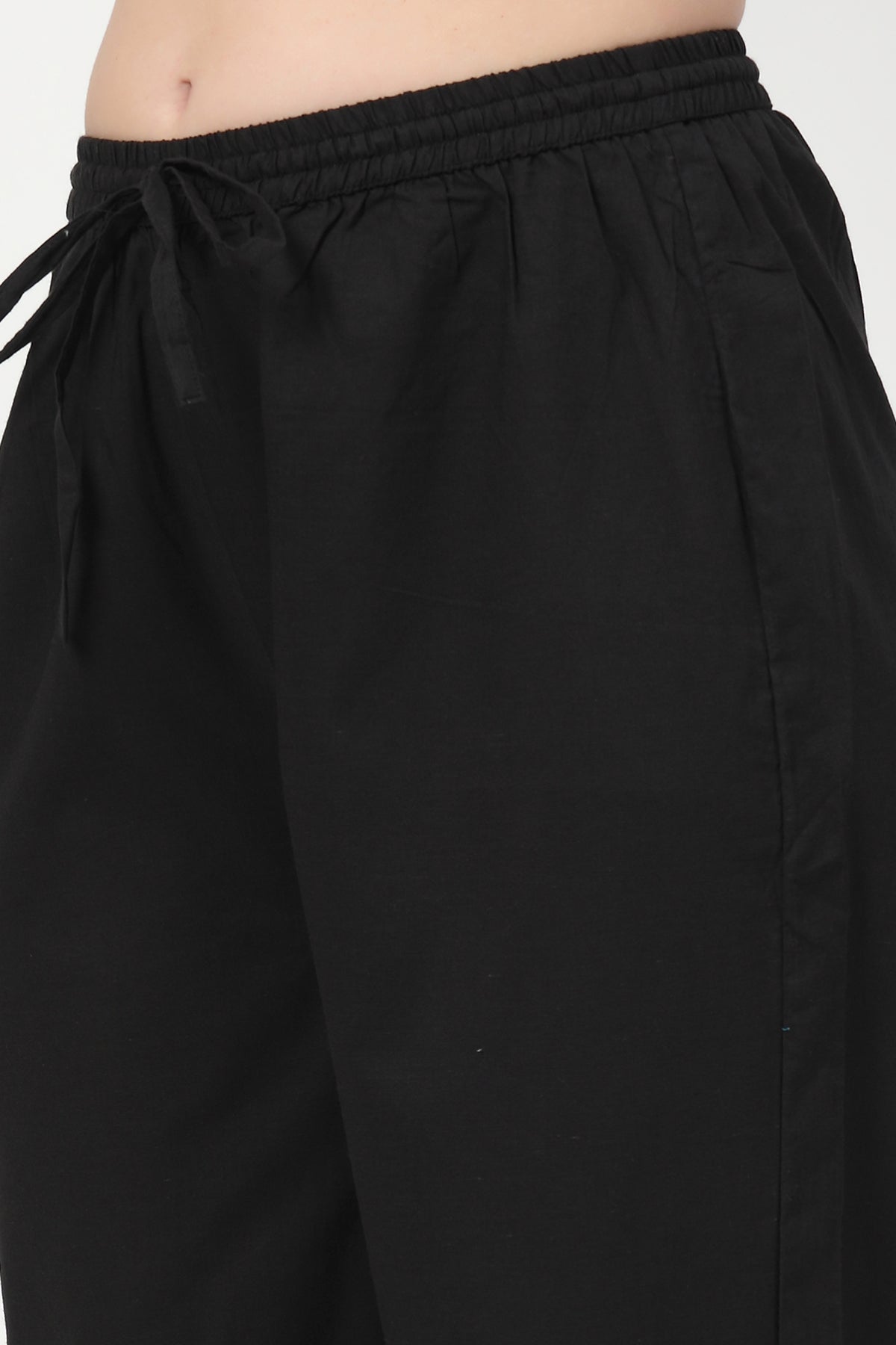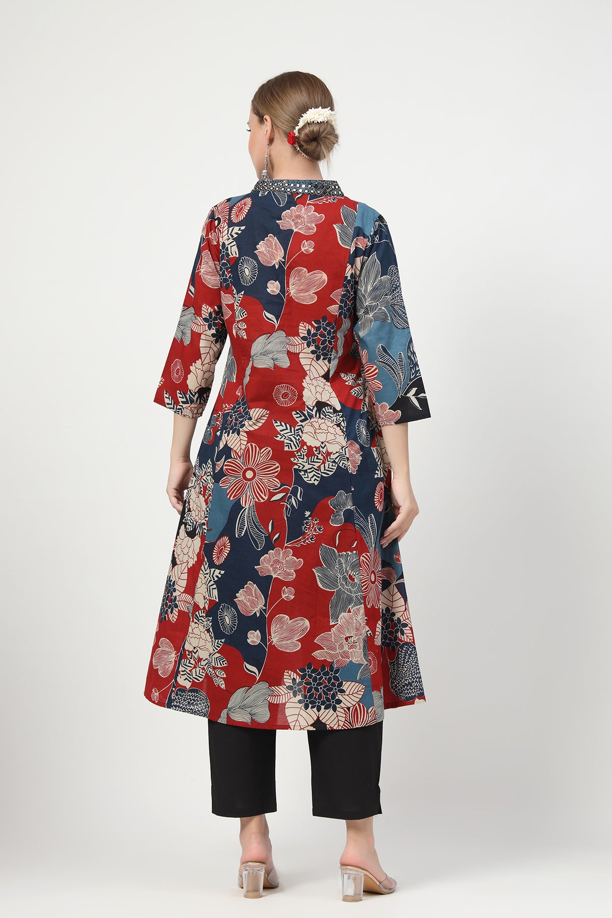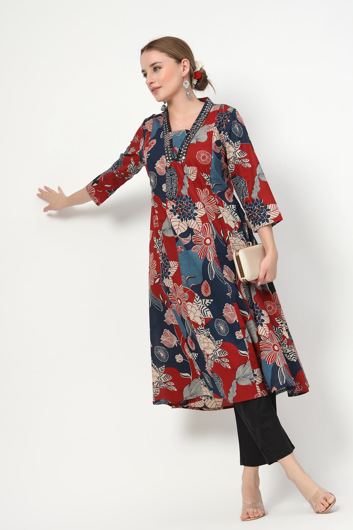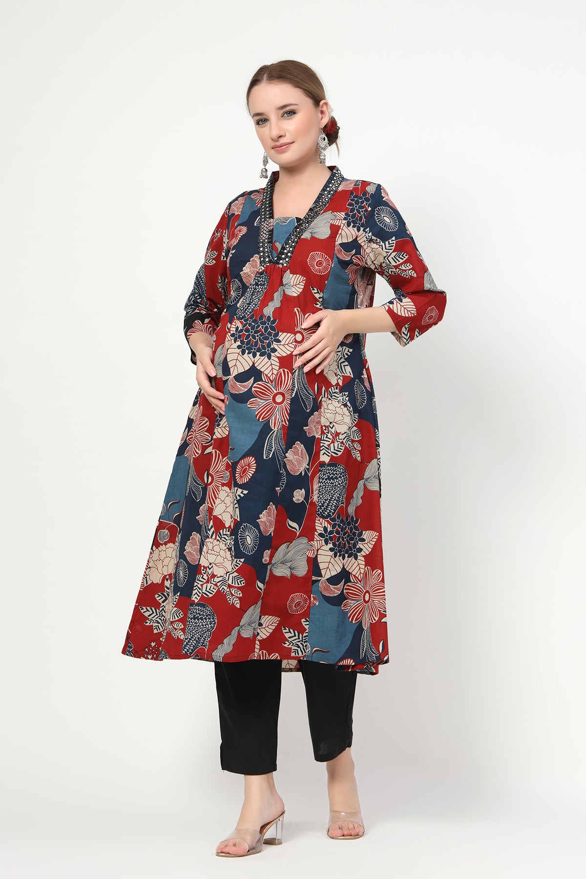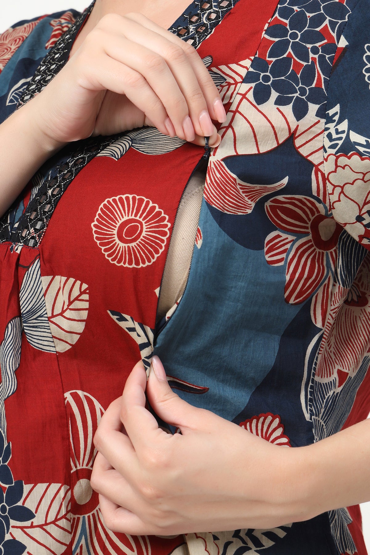 Embroidered Floral Print Cotton Maternity & Nursing Kurta Set - Navy Blue