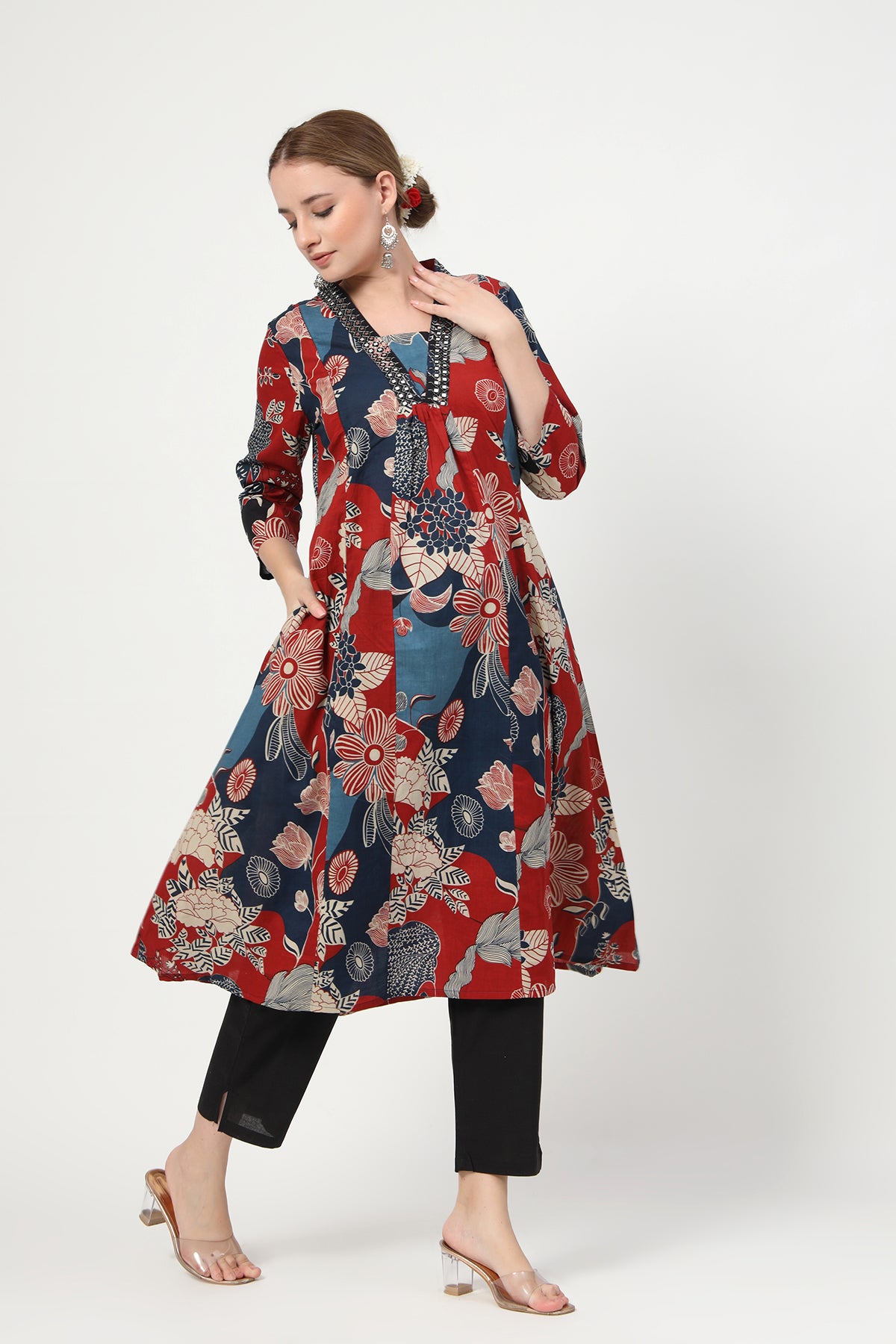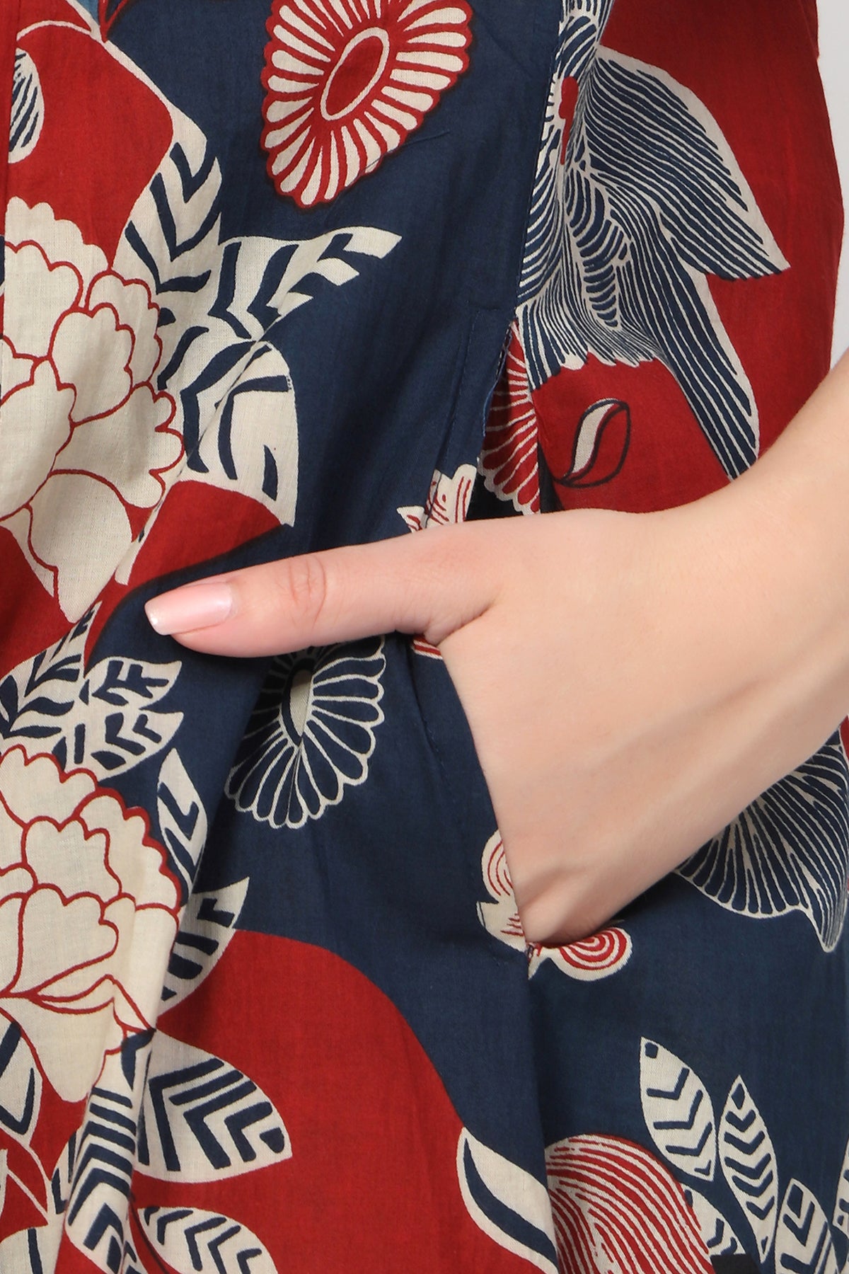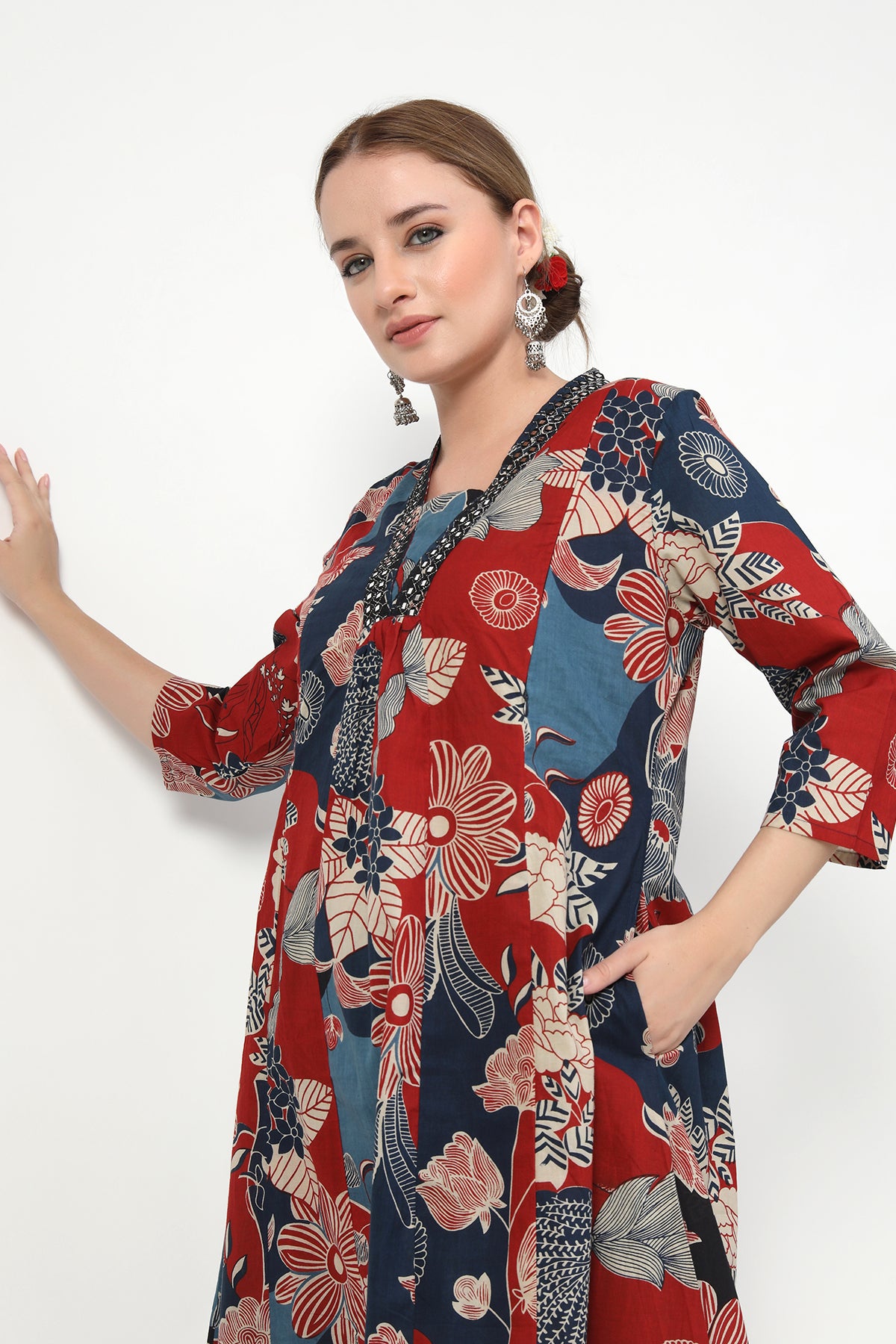 Stay effortlessly chic in this maternity and nursing kurta dress crafted from 100% soft breathable cotton. The beautiful handblock-style floral print and embroidered neckline with lace detailing add a refined ethnic charm. Designed thoughtfully for both pregnancy and postpartum, it features concealed zips for easy feeding access and side pockets for added convenience. The flared A-line silhouette ensures ultimate comfort and a flattering fit through all stages. Wear it as a standalone dress or style it with pants for a more traditional look.