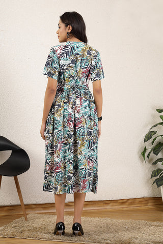 Fabric and Comfort: Our All Over Printed Maternity Feeding Dress is crafted from 100% rayon, offering a luxuriously soft feel and excellent breathability, perfect for sensitive skin during and post-pregnancy. Rayon's fluid drape ensures the dress flows gracefully, accommodating body changes with ease and providing lasting comfort.