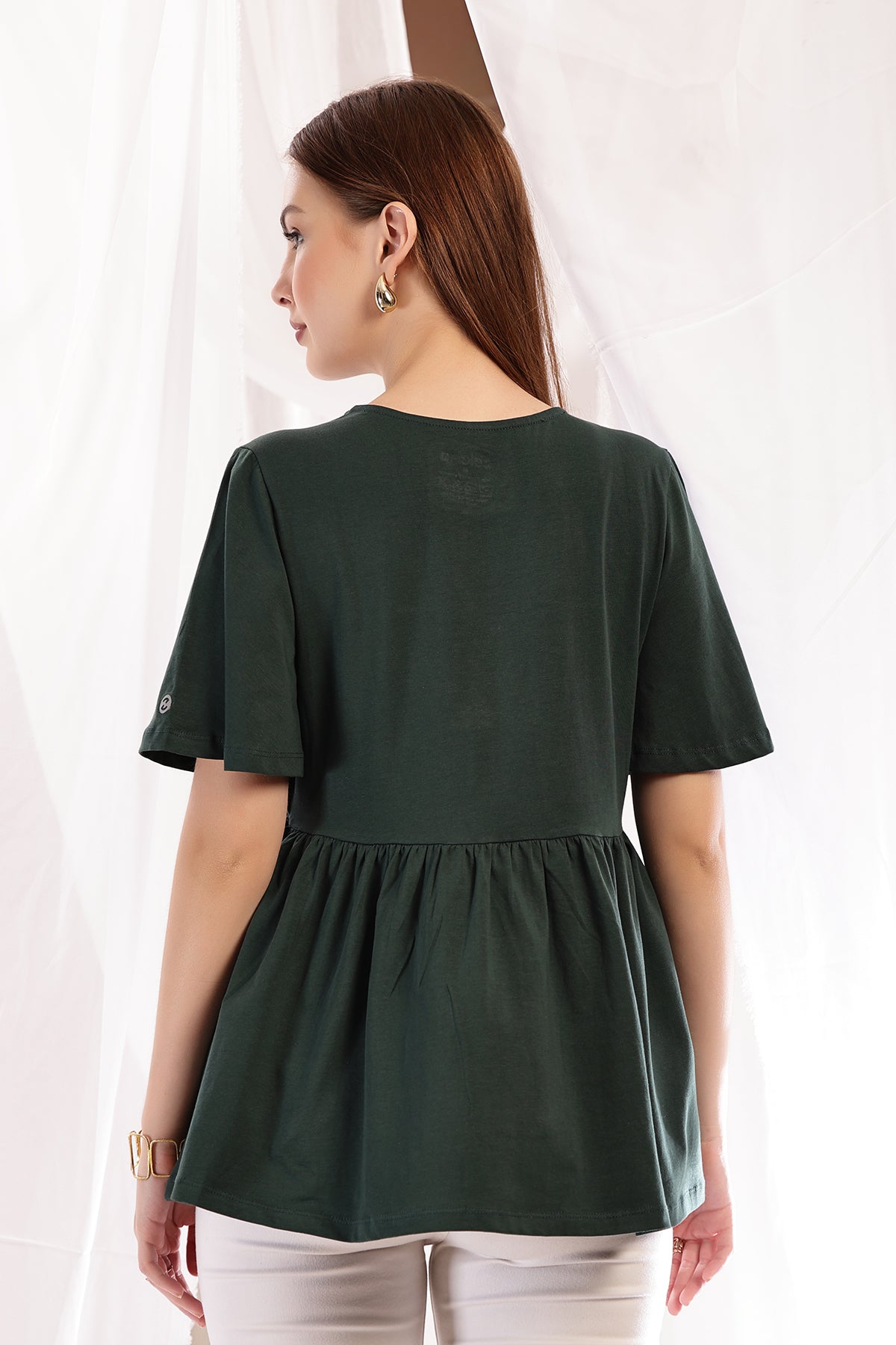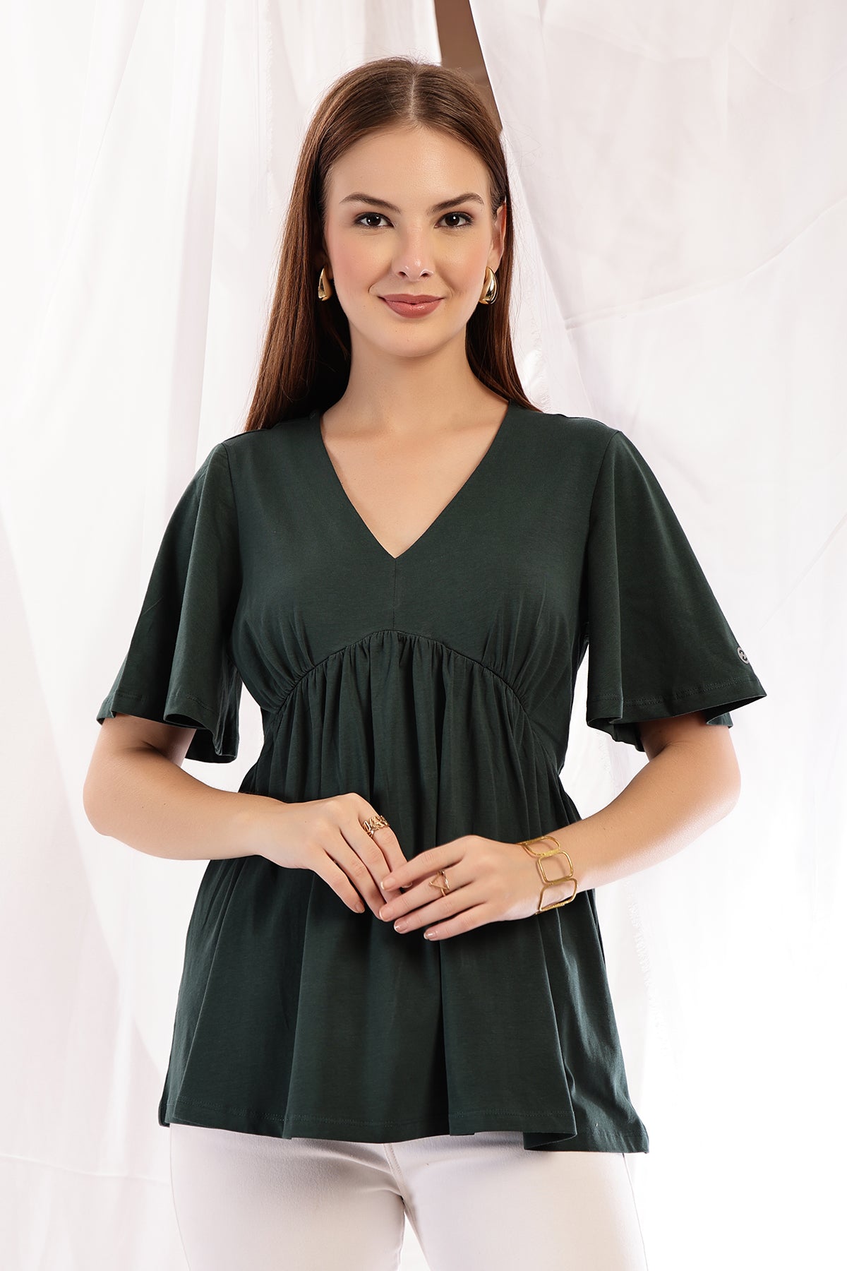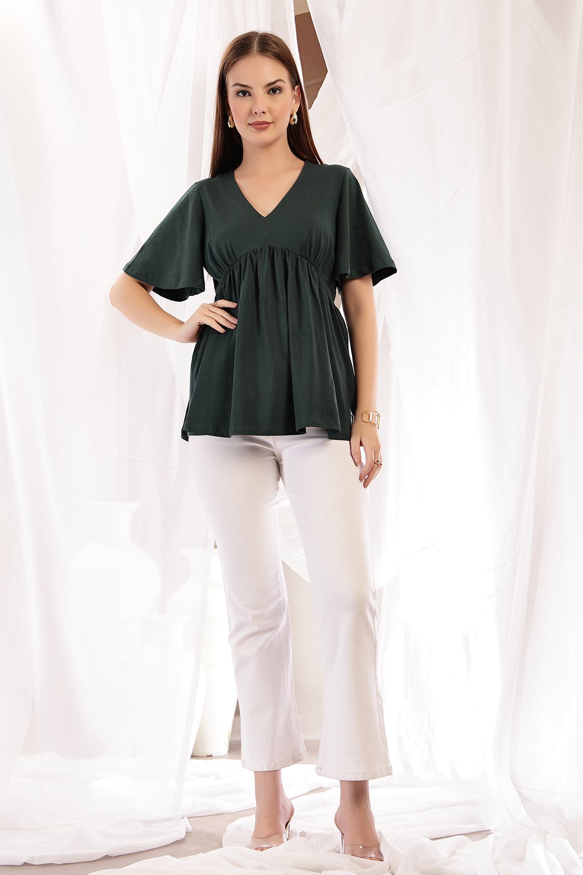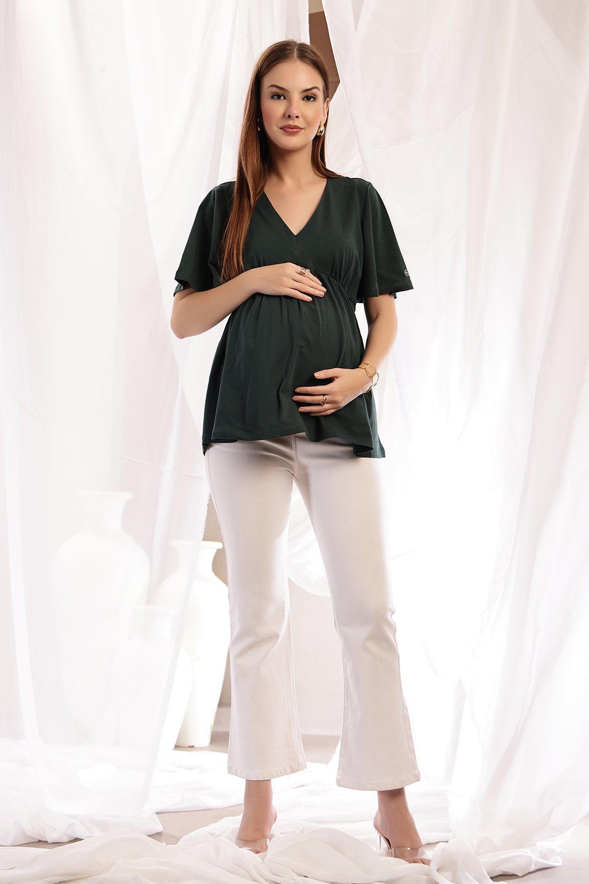 V-Neck Cotton Maternity Nursing Top - Bottle Green