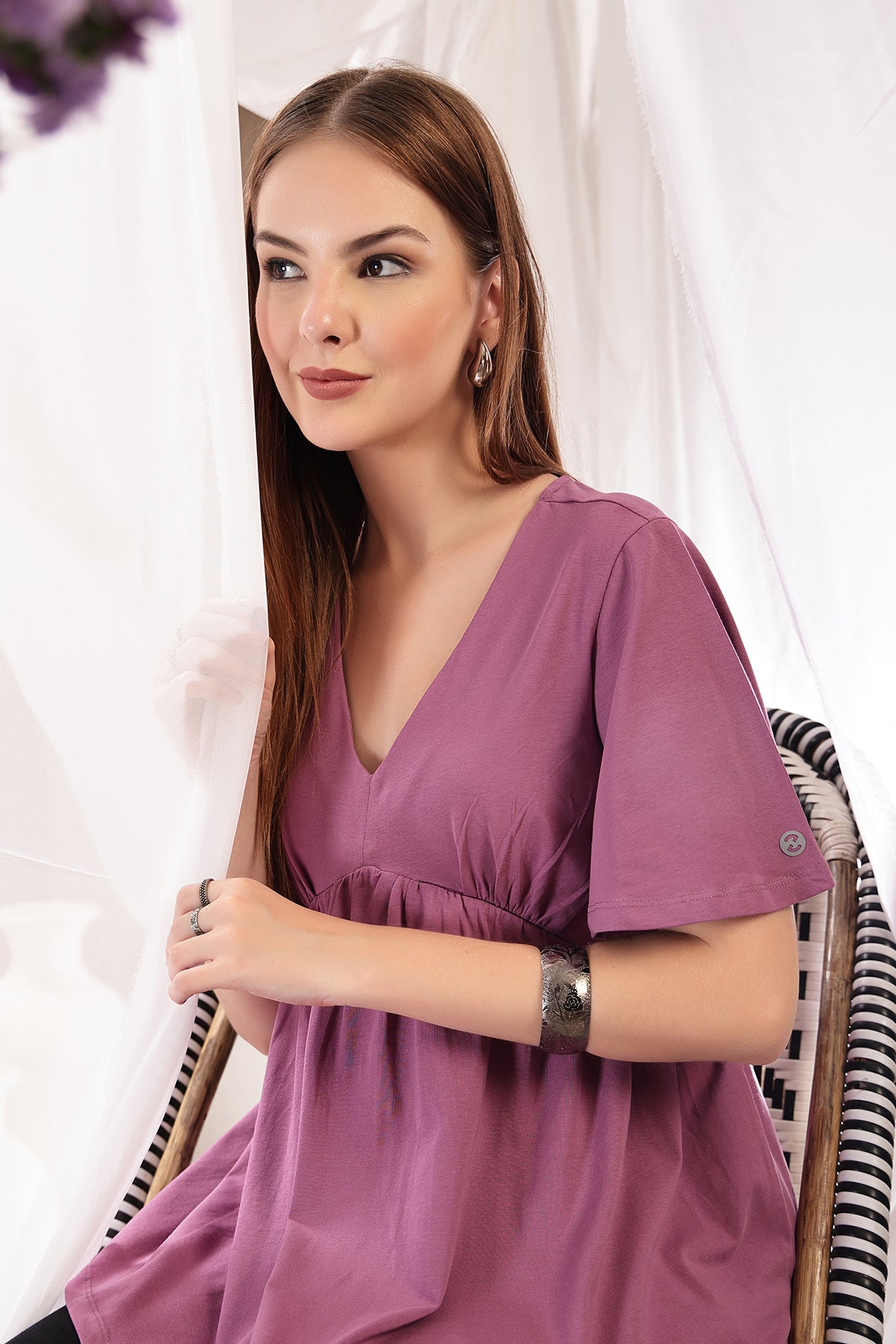 Effortlessly stylish and thoughtfully designed, this maternity and nursing top is crafted from a breathable blend of 95% cotton and 5% elastane, offering all-day comfort with a gentle stretch. Featuring a flattering V-neckline and empire waist gathers, it drapes beautifully over your growing bump while ensuring a relaxed fit. The concealed zip openings make nursing simple and discreet, adding functionality without compromising style.