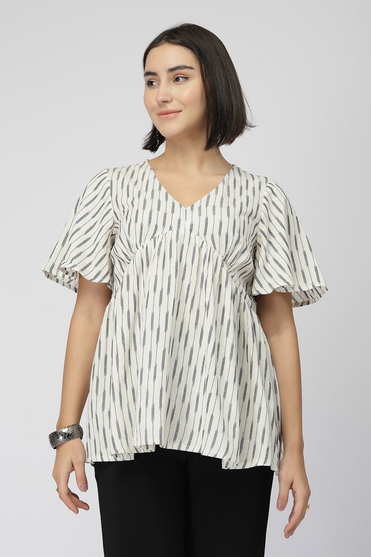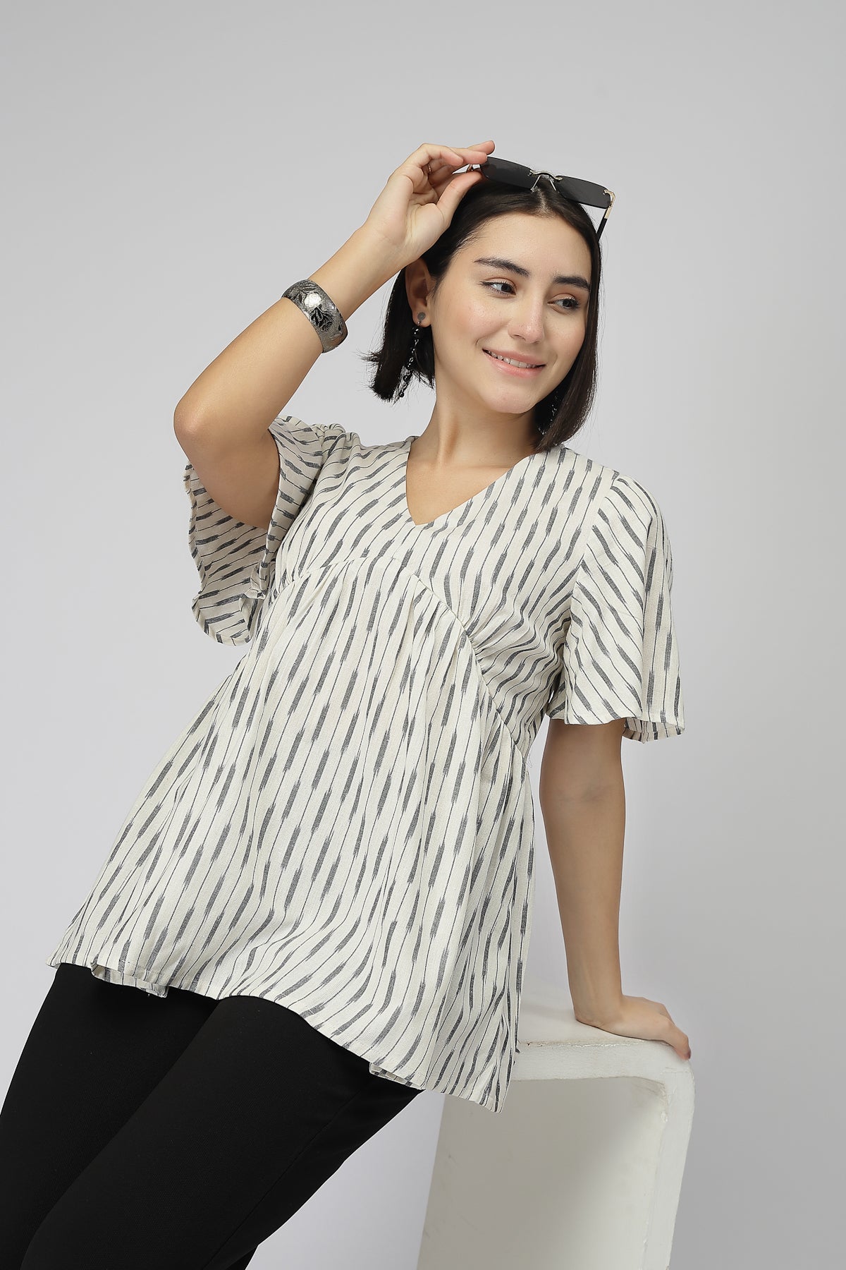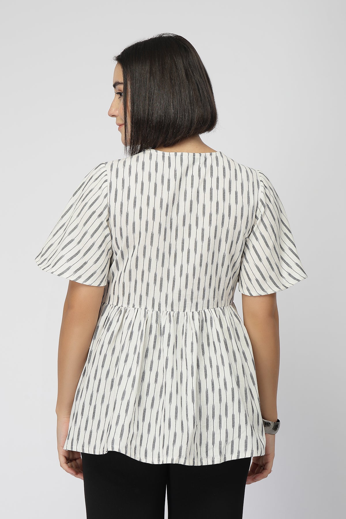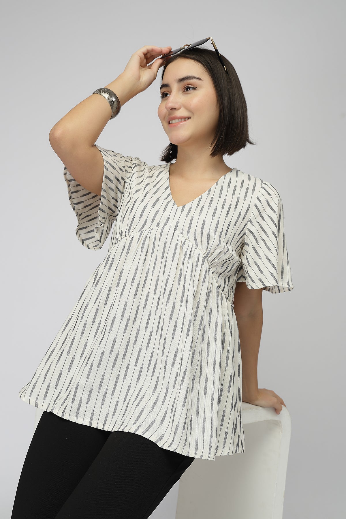Fine Ikat Maternity Gathered Top with Zip - Off White
